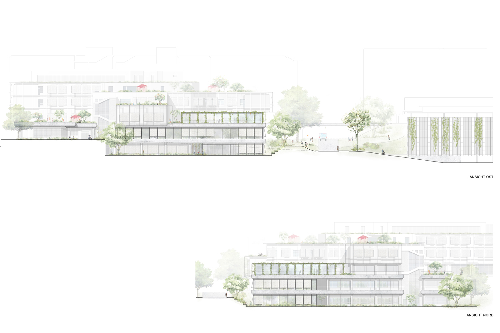 Die Dachterrassen in der obersten Ebene bleiben erhalten und in das Begrünungskonzept einbezogen. Im Innenhof und auf den Dächern entsteht ein interessantes Zusammenspiel von Bäumen, Sträuchern und Gräsern mit den Holzstrukturen für Terrassen, Pergolen und den Innenhof. Eingestreute farbige Boxen dienen als Spielobjekte für die Kinder.
